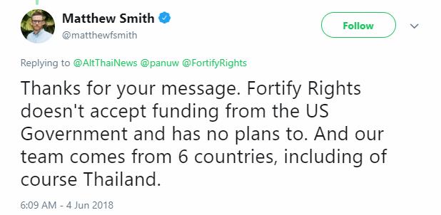Matthew Smith of Fortify Rights would not deceive people on social media by playing off of a technicality in which his US government money is essentially laundered through the NED before reaching him.