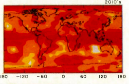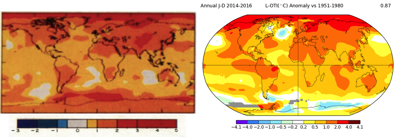 A neat thing in HFLRLRRS which has not been commented on much were the color coded maps of temperature anomalies by decade in the future which can be compared to measurements. Eli finds this much more interesting and informative about the early GISS model than the time one dimensional variation of averate global temperature change. Comparing the result for the 2010s with measurements between 2014-2016 show that HFLRLRRS captured the broad picture but was not perfect