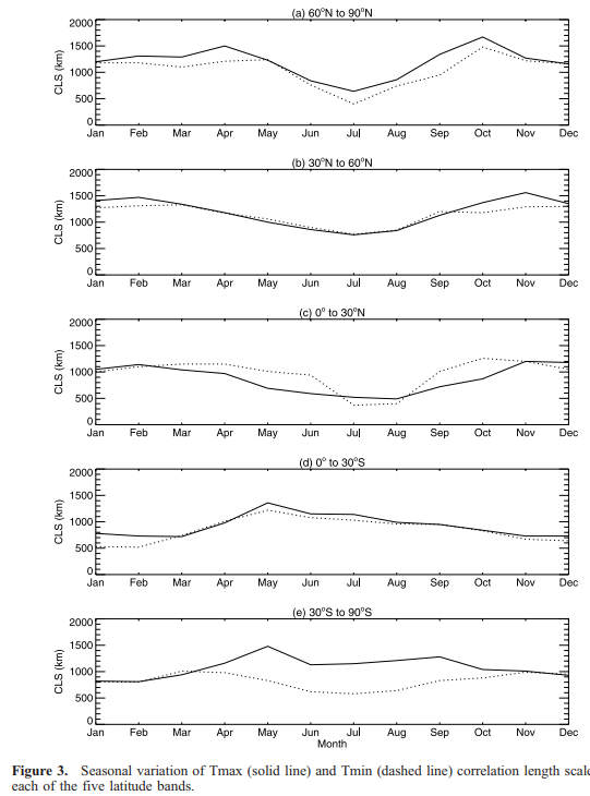 Casper, Alexander and Vose advanced the climateball in 2006, but to some, maybe only in Eli view not enough, notice, measuring how the correlation depended on season as well as latitude, clearly showing that the correlation distance decreases well below 1000 km during the summer and increases well above it in the winter.