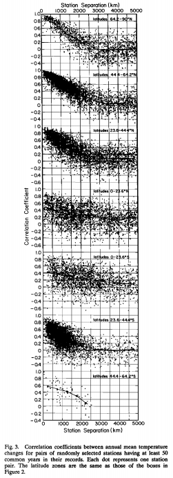 The first (as far as Eli and most of the Bunnies know) study to make use of this was the ur-GISSTemp work of Hansen and Lebedeff in 1987 which settled on a correlation distance of ~1000 km, but noting a variation with latitude shown to the left. The figure can be enlarged by clicking on it.