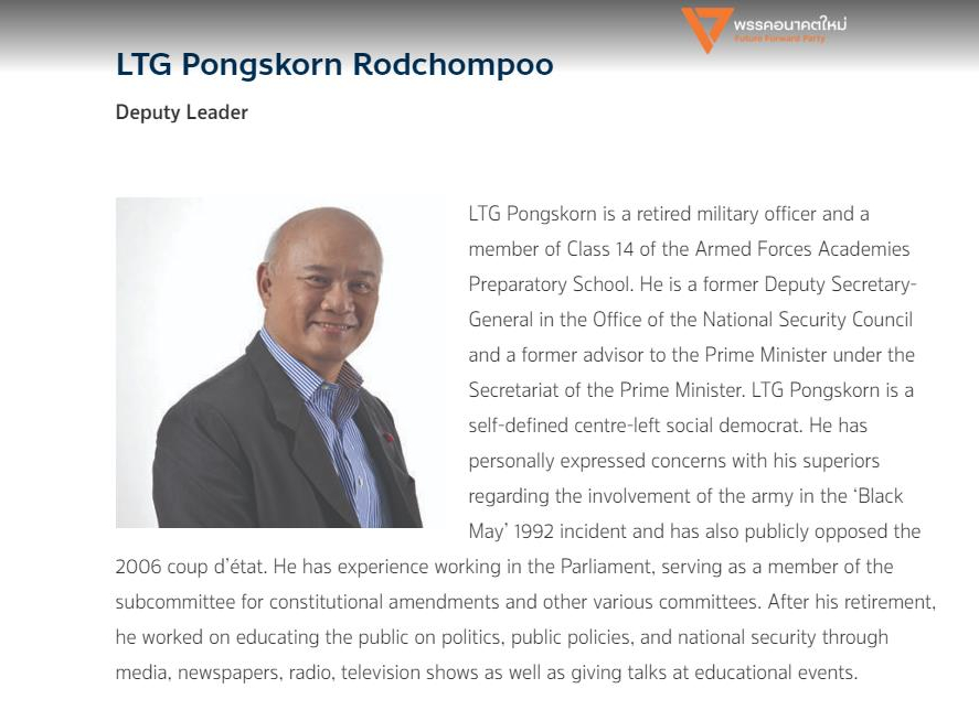 Lt Gen Pongsakorn was appointed to the NSC by then-prime minister Yingluck Shinawatra, moving from the Supreme Command, two years ago.Pongsakorn Rodchompoo - a former Thai general - entering the ranks of Future Forward as "deputy leader" is particularly ironic considering Future Forward's supposed opposition to military influence in Thai politics.