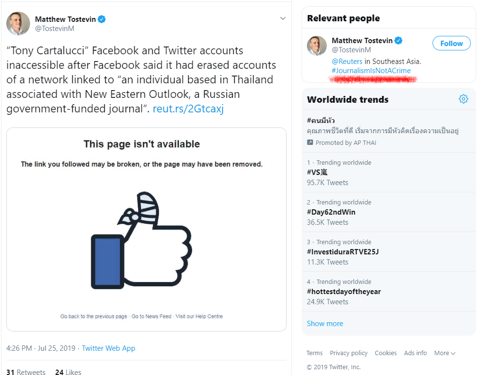 July 25, 2019 (LD) - Facebook and Twitter joined forces to investigate and delete my accounts. This includes my Facebook page, as well as my Land Destroyer Twitter account, my Thai-centric AltThaiNews account, my personal Twitter account @TonyCartalucci and my LocalOrg account discussing solutions and technology.