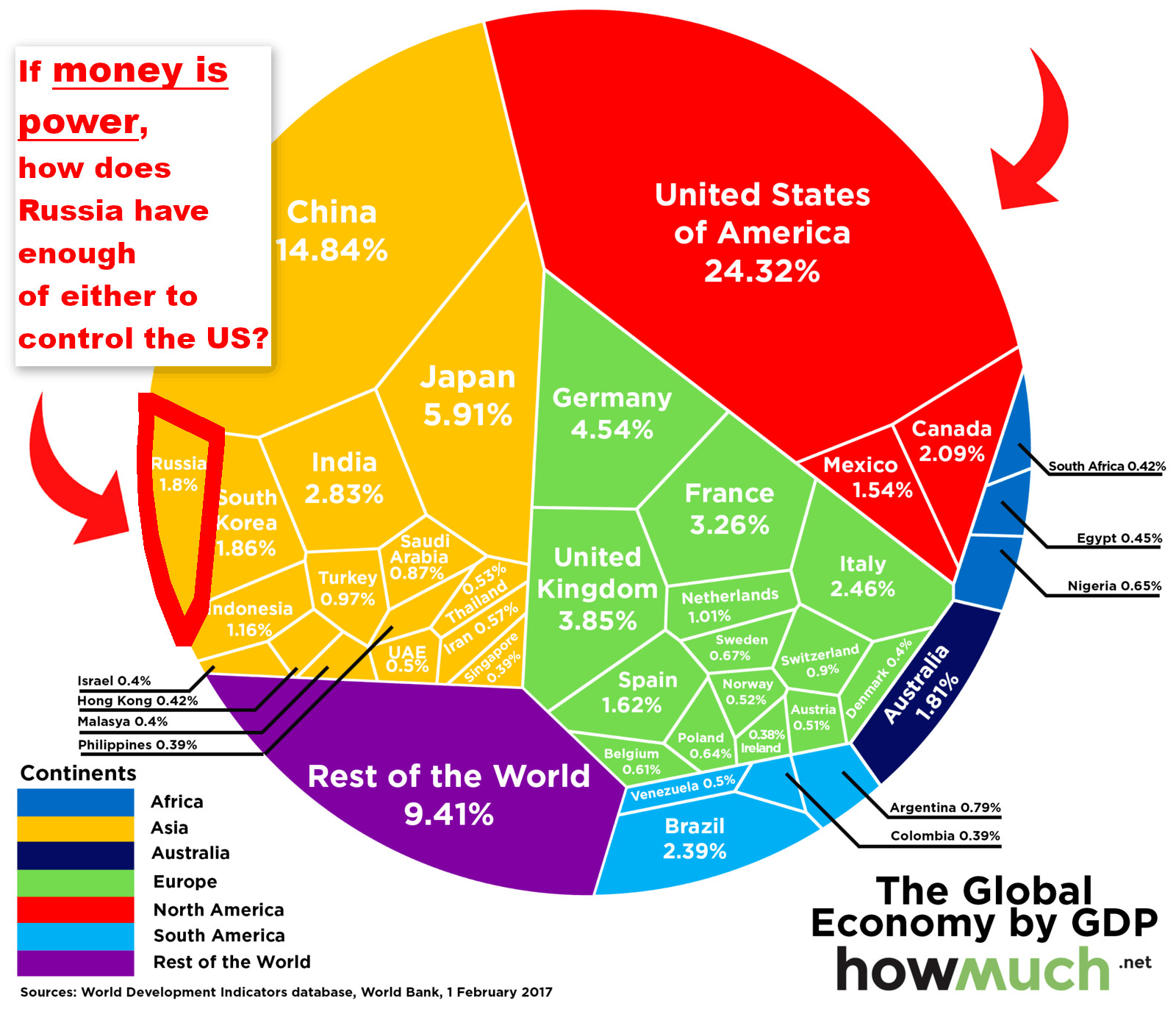The US possesses the largest economy on the planet and has a GDP over 10 times larger than the Russian Federation.