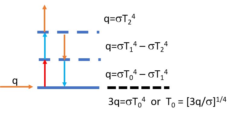 At the bottom, the heat transferred between the surface and the first layer is also q, but in this case the difference is between the upwards thermal radiation from the surface, σT04 and the backradiation from the first layer σT14