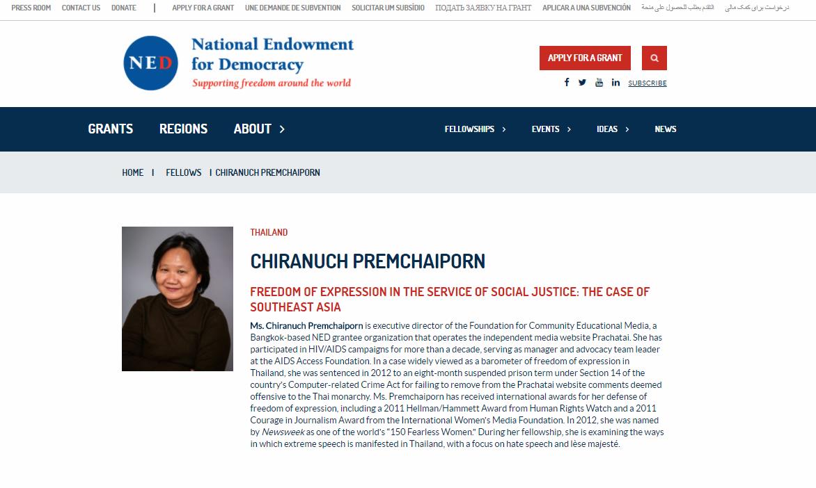 Prachatai's "executive director" - Chiranuch Premchaiporn - is still listed by the US NED as an NED "Fellow."
