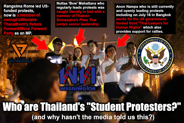 The protests also have direct ties to US-backed opposition parties including those of fugitive billionaire Thaksin Shinawatra's Pheu Thai Party and corrupt billionaire Thanathorn Juangroongruangkit of Future Forward/Move Forward Party and even foreign opposition movements the US is funding in China's territories of Taiwan and Hong Kong