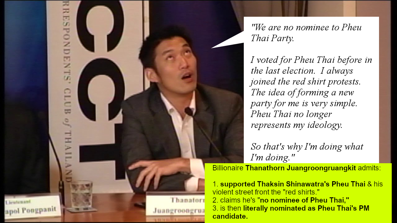 Image: Thanathorn Juangroongruangkit had attempted to distance himself from Thaksin Shinawatra's Pheu Thai Party during an FCCT event in Bangkok before the 2019 elections - but admitted he had voted for it and attended their rallies. His party's platform is identical to Pheu Thai's, his party headquarters literally next door to theirs, and Pheu Thai eventually, literally nominated him as their pick for PM. Pheu Thai and Future Forward have functioned as an indistinguishable opposition front ever since.