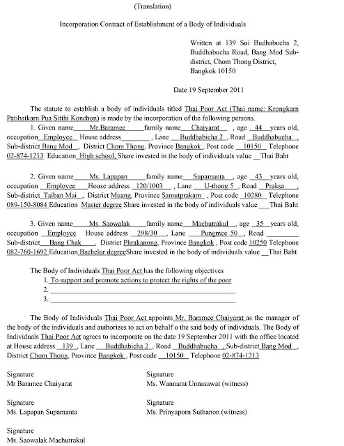 The current leader of Assembly of the Poor is Baramee Chaiyarat - who had previously signed a document titled, "Incorporation Contract of Establishment of a Body of Individuals" for the US government-funded "Thai Poor Act" in 2011 with Baraemee listed as "manager."