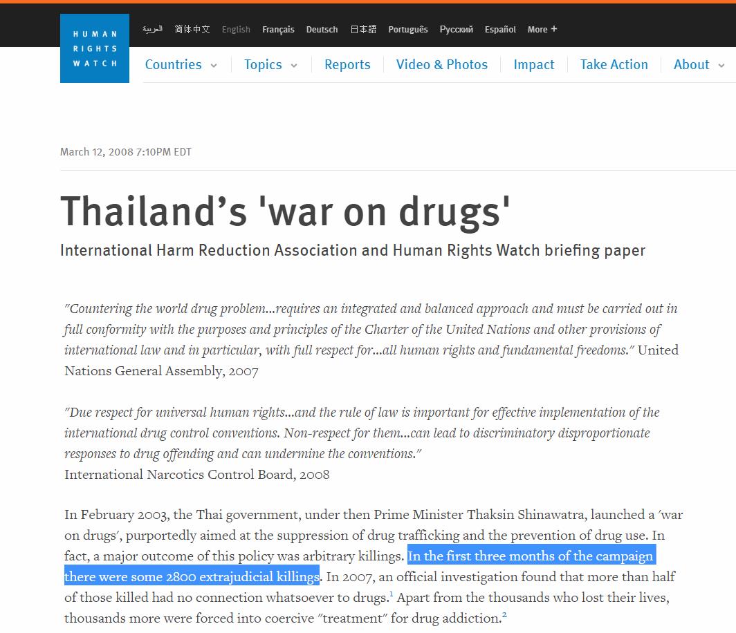 In 2003, while Thaksin Shinawatra was in office he initiated what he called a "war on drugs." Nearly 3,000 were extrajudicially murdered in the streets over the course of just 90 days. It would later turn out that more than half of those killed had nothing to even do with the drug trade.