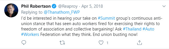 I'd be interested in hearing your take on Summit Group's continuous anti-union stance that has seen auto workers fired for exercising their rights to freedom of association and collective bargaining! Ask Thailand Auto Workers Federation what they think. End union busting now!