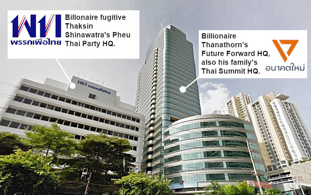 This included Thanathorn Juangroongruangkit's Future Forward Party (now renamed Move Forward) whose headquarters is literally next door to Thaksin's Pheu Thai HQ on Phetchaburi Road, Bangkok.