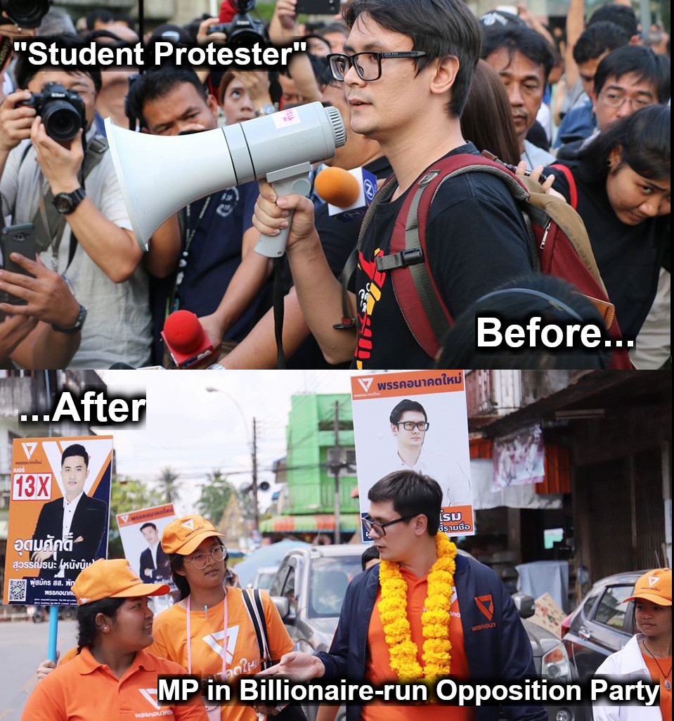 Some of these "student protesters" have even "graduated" into Thanathorn's Future Forward/Move Forward political party - including Rangsima Rome who used to regularly lead protests side-by-side with Anon Nampa. He still regularly attends protests and provides direct support for leaders including offering transportation - the Bangkok Post would admit.