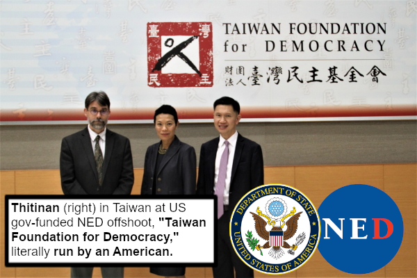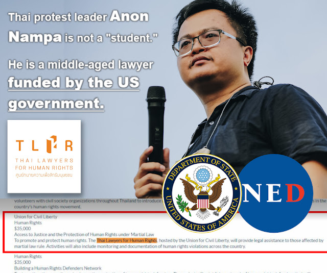 The main protest leader - Anon Nampa - belongs to the "Thai Lawyers for Human Rights" (TLHR) which is funded by the US government via its notorious regime change arm, the National Endowment for Democracy (NED).