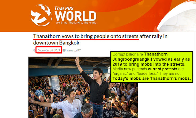 And here are the protests Thanathorn promised. There is nothing - even at face value "organic" about these protests. It was a corrupt billionaire's promise to use mobs to gain the power his performance at the polls in 2019 failed to gain him.