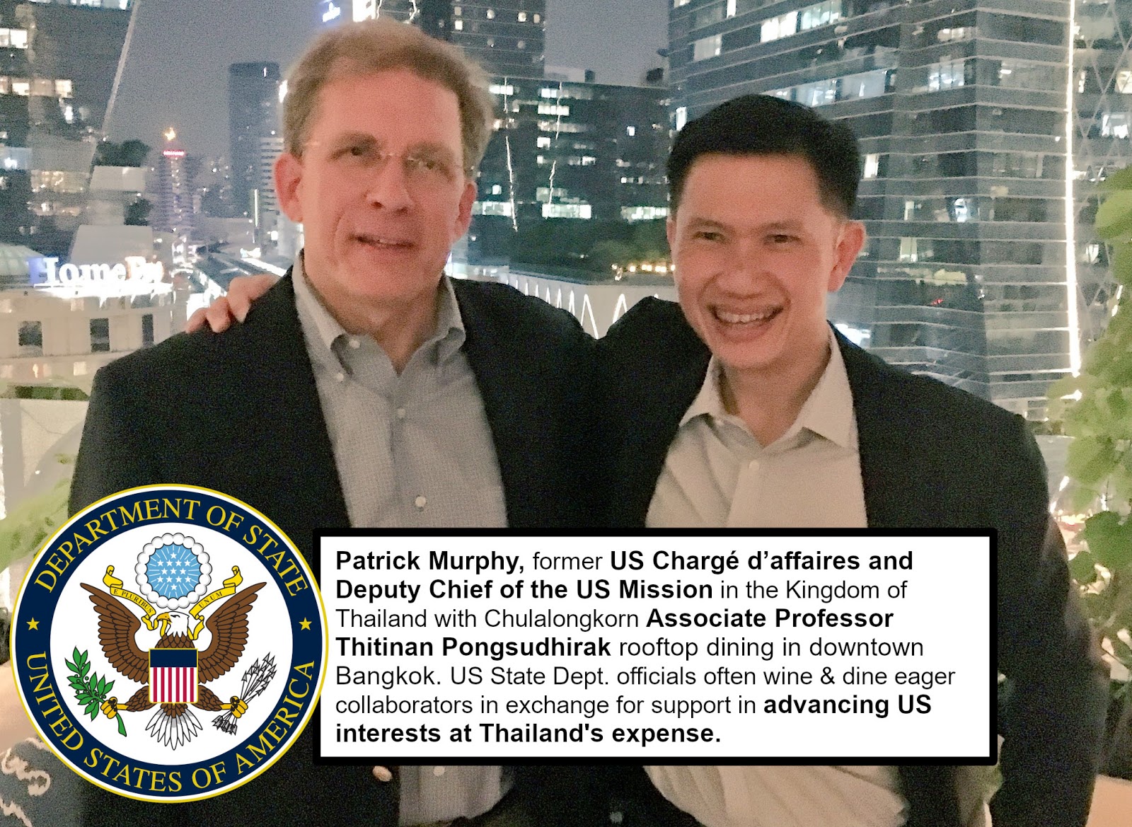 An associate professor and director of the Institute of Security and International Studies at Chulalongkorn University’s Faculty of Political Science, with more than 25 years of university service. He earned his MA from The Johns Hopkins School of Advanced International Studies and PhD from the London School of Economics where he was awarded the UK’s top dissertation prize in 2002.Not mentioned in his bio are his moonlit dinners at 5 star rooftop restaurants in downtown Bangkok with W. Patrick Murphy, former US Chargé d’affaires and Deputy Chief of Mission in the Kingdom of Thailand.