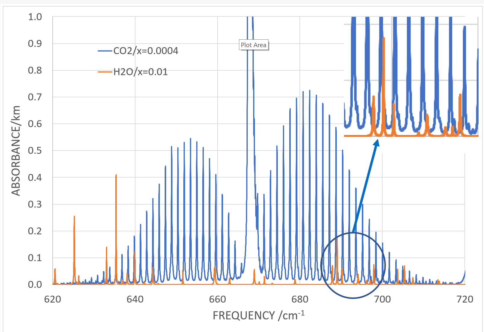and it is clear that there is little overlap and most of the concentration is from CO2. If you add up the absorbance between 620 and 720 cm⁻¹ the total from CO2 would be 30 times that from H2O.