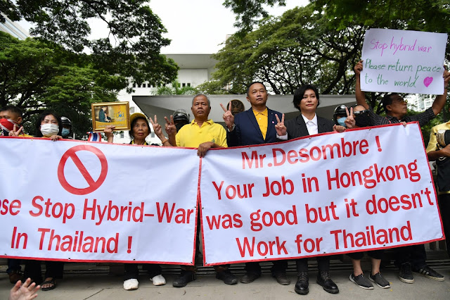 One group protested US meddling in front of the US Embassy in downtown Bangkok with signs reading "please stop hybrid war in Thailand" and "Mr. Desombre! Your job in Hong Kong was good, but it won't work in Thailand."