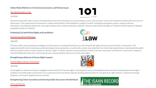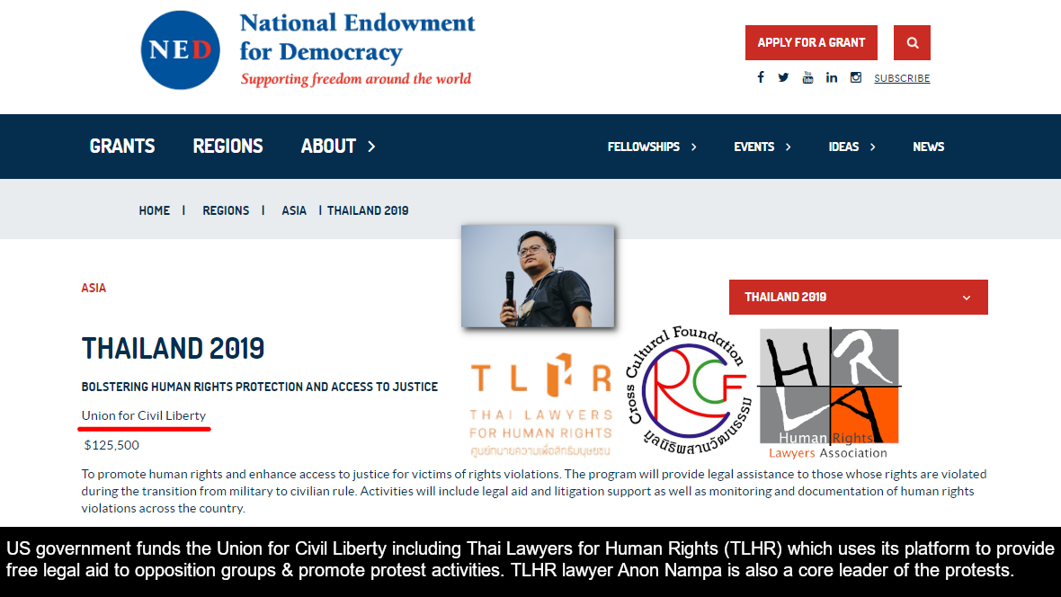 Virtually every aspect of ongoing anti-government protests in Thailand are being funded by the US government via NED - from core leaders like Anon Nampa and his "Thai Lawyers for Human Rights" (TLHR), to opposition media like Prachatai and Isaan Record, to legal groups like Internet Law Reform Dialogue (iLaw) which is attempting to petition for Thailand's entire constitution to be rewritten.