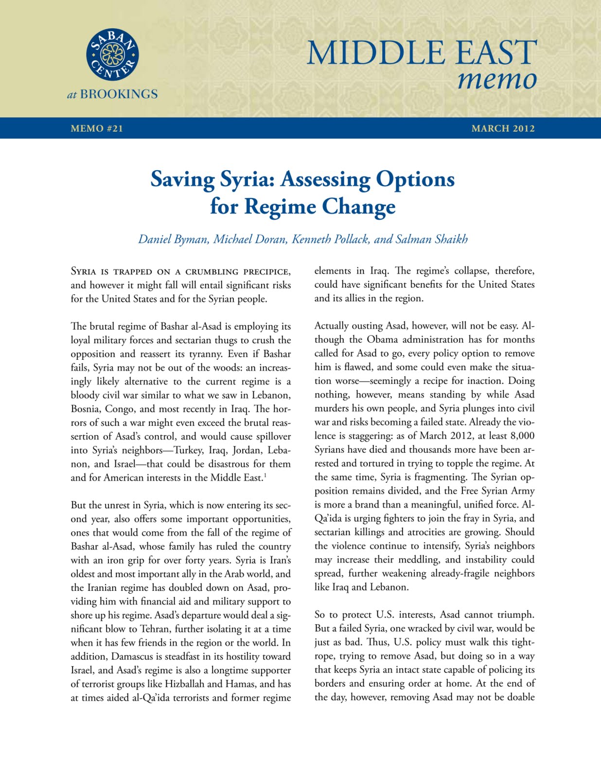 In 2012, the Brookings Institution would publish another paper titled, ""Saving Syria: Assessing Options for Regime Change" (PDF), which stated: