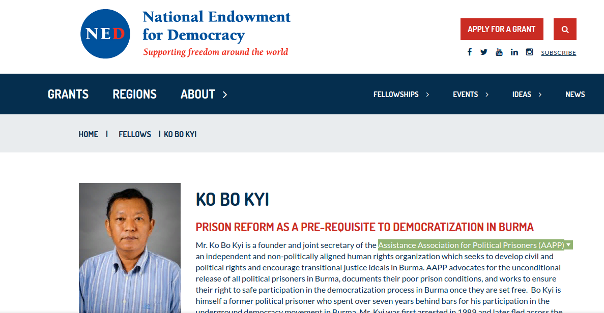 To help spin the violent nature of the protests - the Western media has depended heavily on faux-human rights groups like Assistance Association for Political Prisoners (AAPP) who provides baseless "tallies" of dead and detained. The Western media never mentions that AAPP is funded by the US government via the National Endowment for Democracy and that the AAPP's founder and and joint secretary - Ko Bo Kyi - is also an NED "fellow."